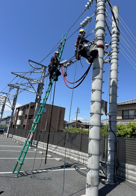 新入社員は、梯子昇降と墜落制止用器具の取り扱い、他若手社員は、電化柱引留め碍子取替作業を、何度も行い今後の作業に活かし「労災防止」「事故防止」に努めます。