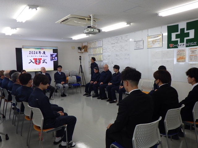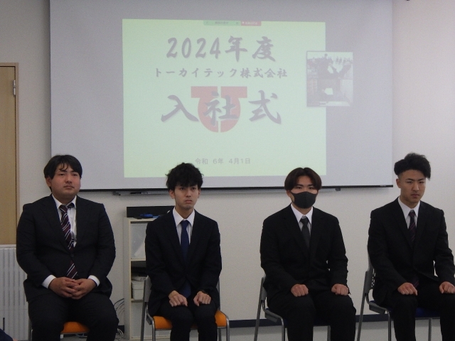 2024年度入社式 2024.04.01 NEWS 2024年4月1日 2024年4月1日に新入社員2名、出向受け社員1名、中途採用社員1名の入社式を執り行いました。 ・緊張な面持ちの社員 ・社長以下当日出勤した全社員から激励の挨拶